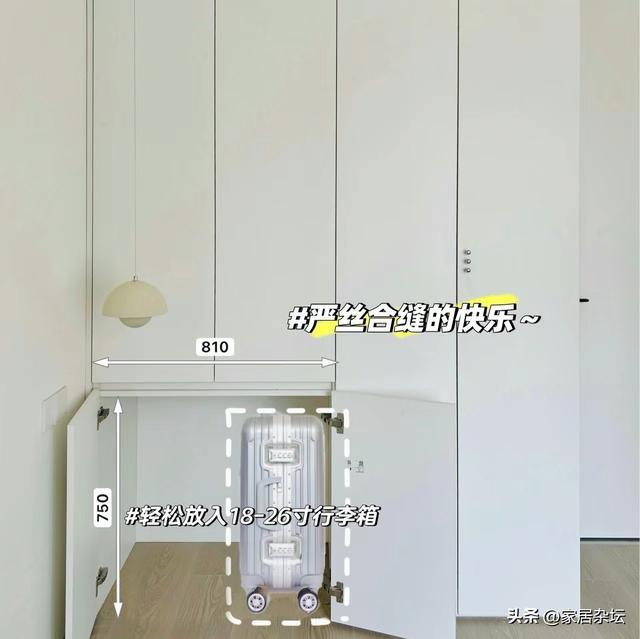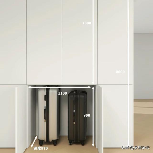 ③、方式选择。行李箱柜要选柜子最下面,而且是柜子底部空一格的做法,这样行李箱可以直接推进去。