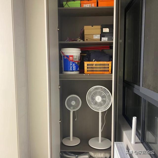 ①、位置设计。对于落地扇,空气循环扇,也是建议我们大家可以选择收纳在阳台柜或者是衣柜里面。