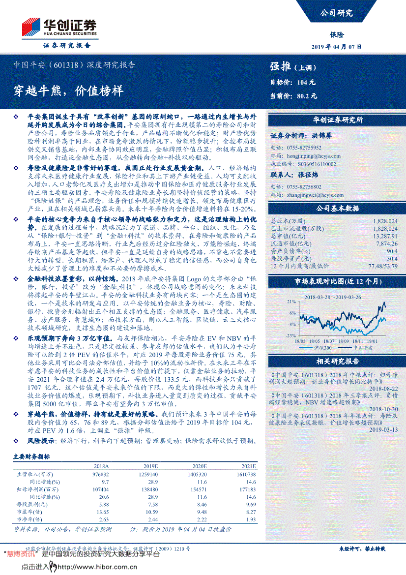 证监会审核华创证券投资咨询业务资格批文号:证监许可(2009)1210号 未经许可,禁止转载证券研究报告中国平安(601318)深度研究报告 强推(上调) 穿越牛熊,价值榜样目标价:104元当前价:80.2元平安集团诞生于具有“改革创新”基因的深圳蛇口,一路通过内生增长与外延并购发展成为今日的综合集团。